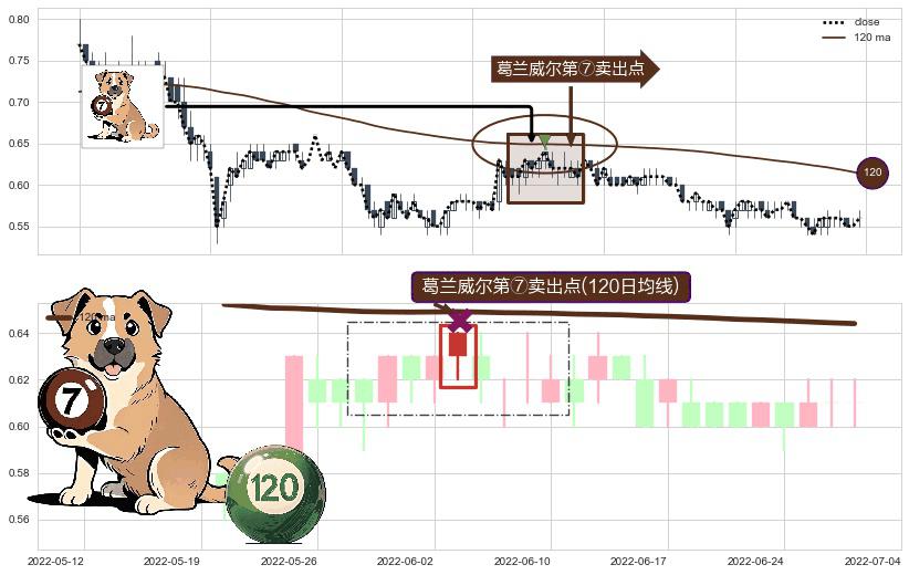 形态多维评估: ⚀ 2022-06-06-日显现 葛兰威尔均线 120日均线 第⑦卖出点 下降趋势的中继信号,后市看跌,卖出信号