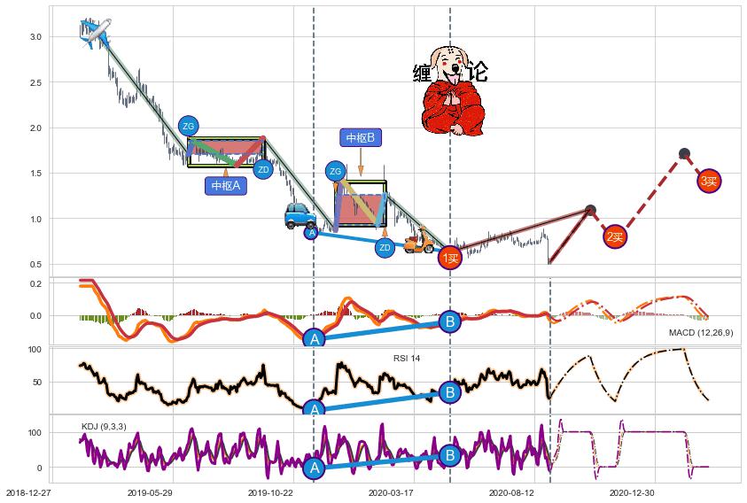➣ 【中枢B】:2019-12-10-2020-02-12,中枢由4笔构成,共42交易日, ZG=1.2600, ZD=0.9300