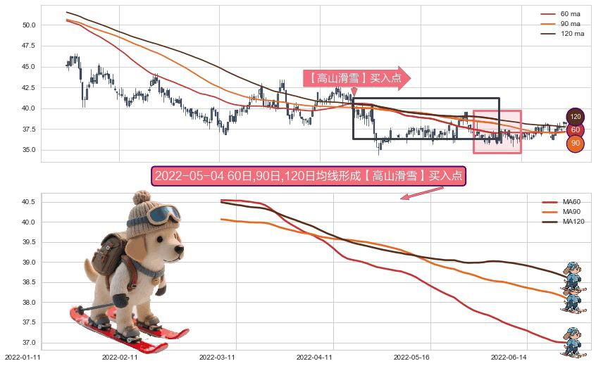 ⚀ 2022-03-08日-2022-06-24日显现 60日-90日-120日均线 【高山滑雪】买入点 看多信号,后市看涨,买入