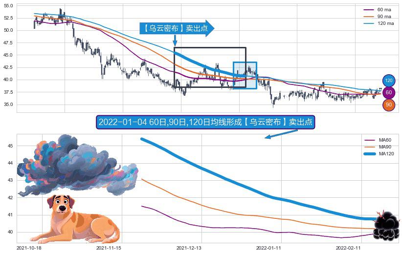 ⚀ 2021-11-22日-2022-02-18日显现 60日-90日-120日均线 【乌云密布】卖出点 看空信号,后市看跌,卖出