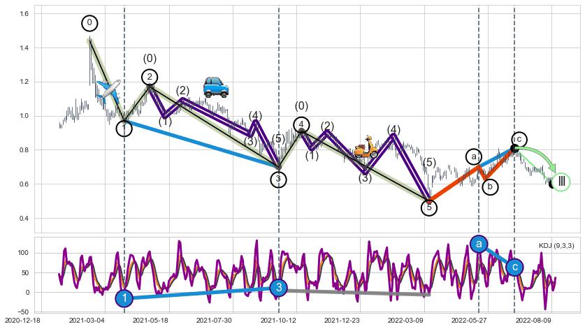 | 3 🅚:下跌两颗星 | 下跌三颗星 ➕ 🌊:波浪理论下跌5浪延续:猜想C点强阻力小反弹终止,猜想保持下跌5浪方向下行(均值回复后大周期继续趋势跟踪) ☞ 看空信号 ⇥ 【🅚线】交织【图形】⇥ 综合量化分数: 35 | > |