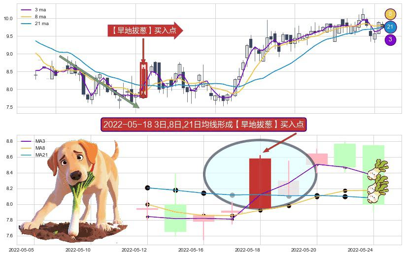⚀ 2022-05-18日显现 3日-8日-21日均线 【旱地拔葱】买入点 看多信号,后市看涨,买入