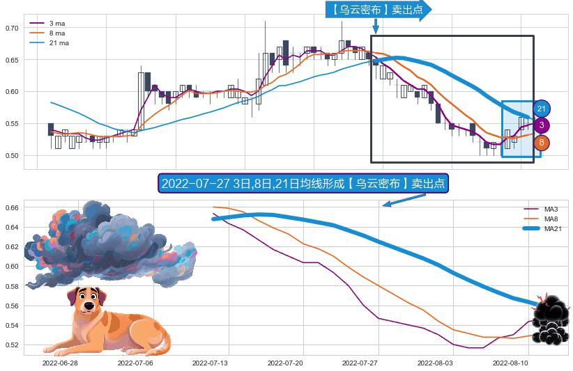 ⚀ 2022-07-12日-2022-08-11日显现 3日-8日-21日均线 【乌云密布】卖出点 看空信号,后市看跌,卖出