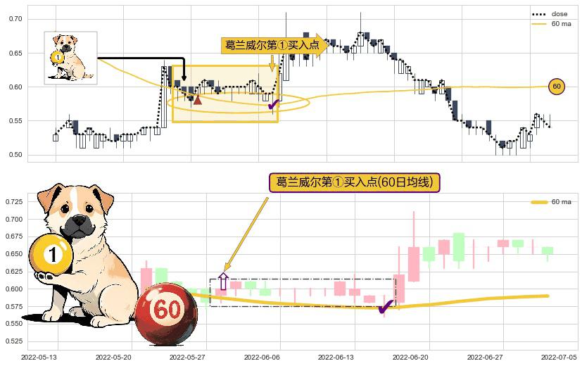 ⚀ 2022-05-30-日显现 葛兰威尔均线 60日均线 第买①入点 走势反转见底信号,后市看涨,买进信号