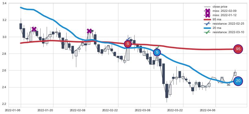 下跌趋势2022-01-06-2022-04-19,均线20, 95确认关键阻力2处