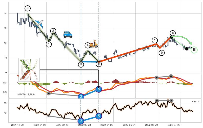 ➣ 第一, 三, 五浪下跌动能逐渐【衰弱变小】,趋势呈现不稳迹象