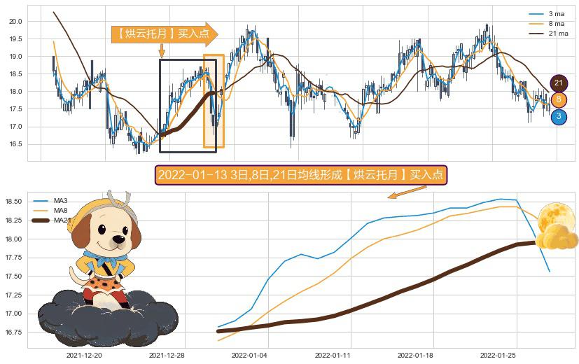 形态多维评估: ⚀ 2021-12-30日-2022-01-27日显现 3日-8日-21日均线 【烘云托月】买入点 看多信号,后市看涨,买入
