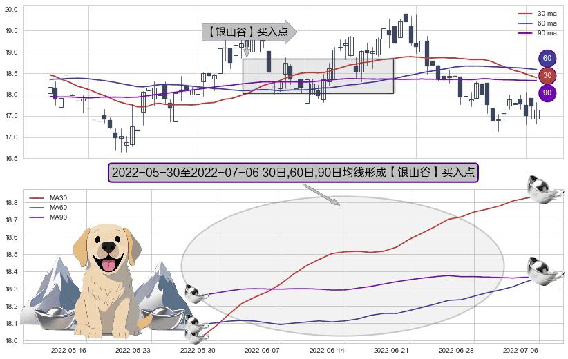 形态多维评估: ⚀ 2022-05-31-日至2022-07-06-日显现 30日-60日-90日均线 【银山谷】买入点 看多信号,后市看涨,买入