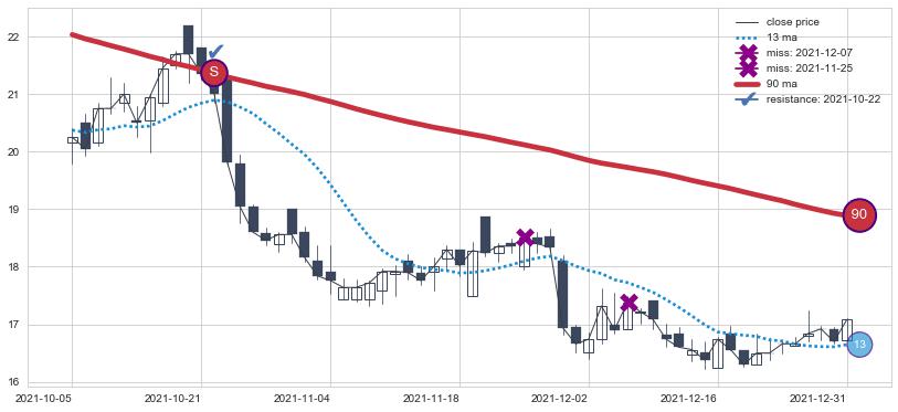 下跌趋势2021-10-05-2021-12-31,均线90确认关键阻力1处