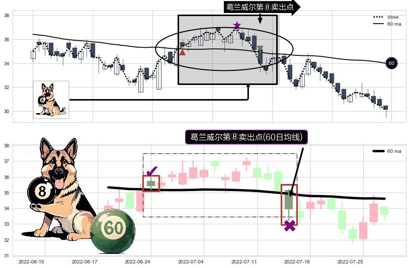 ⚀ 2022-07-14-日显现 葛兰威尔均线 60日均线 第⑧卖出点 下降趋势的中继信号,后市看跌,卖出信号