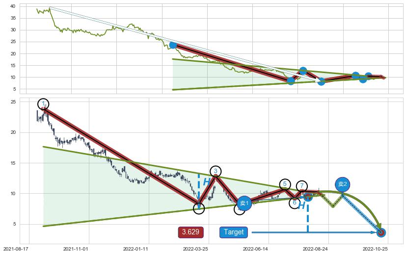 ➣ 【未确认突破,预测即将形成突破】下降【对称】三角形整理起点:2021-09-02, 预测突破点:2022-08-01,形态共222交易日