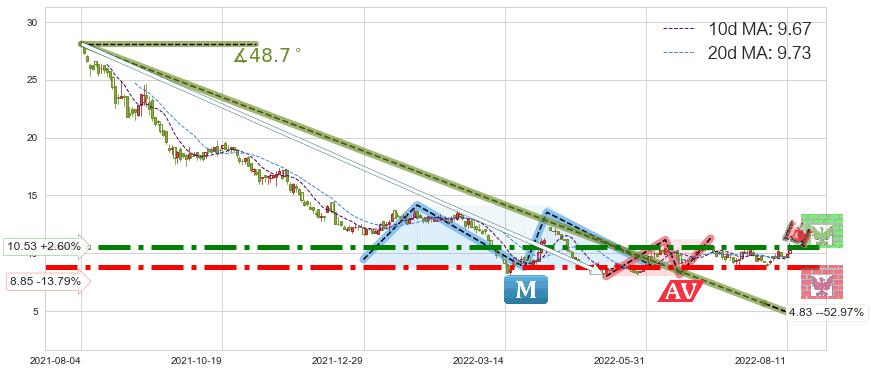 ♘ 阻力价格位10.53,可信任强度85.99%,距离最后交易2022-08-12形成的收盘价格10.26相差 +2.60%