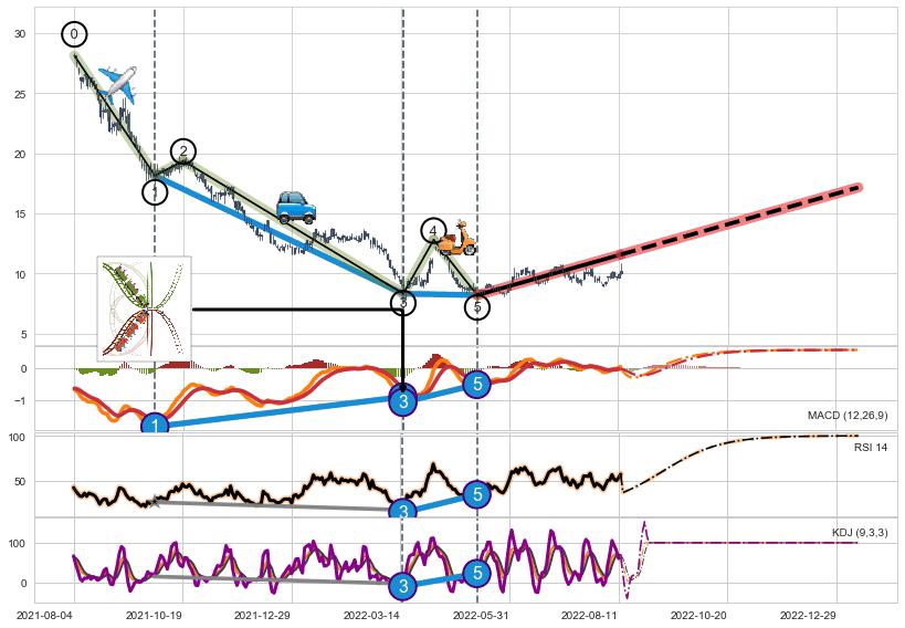 ➢ 1,3,5驱动浪MACD, RSI, KDJ走势都出现【常规背离】反转信号增强