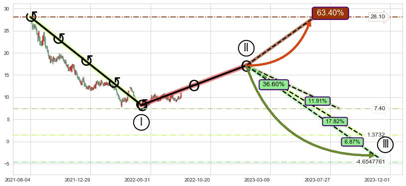 ➢ 循环浪继续向下【最高】位置(2023-08-17, 7.40),匹配聚类样本比例32.53%, 可能性概率11.91%