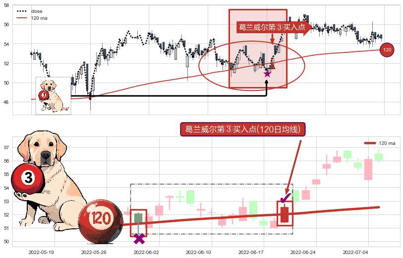 ⚀ 2022-06-21-日显现 葛兰威尔均线 120日均线 第③买入点 上升趋势的中继信号,后市看涨,买进信号