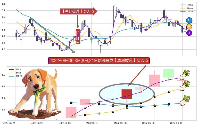 ⚀ 2022-06-06日显现 3日-8日-21日均线 【旱地拔葱】买入点 看多信号,后市看涨,买入