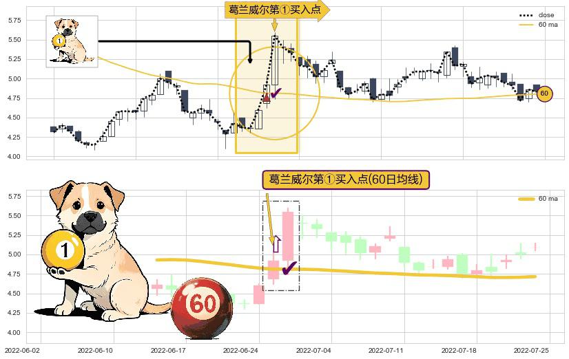 ⚀ 2022-06-27-日显现 葛兰威尔均线 60日均线 第买①入点 走势反转见底信号,后市看涨,买进信号