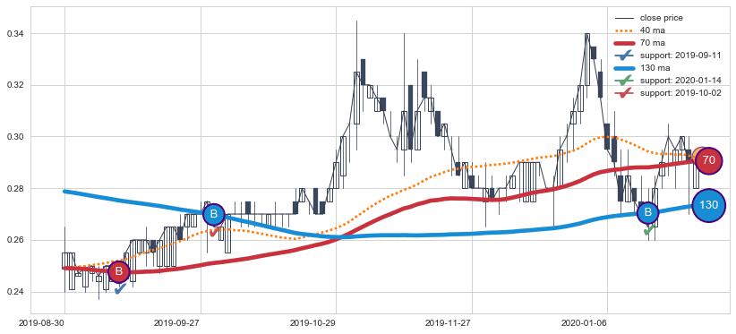 上涨趋势2019-08-30-2020-01-24,均线130, 70确认关键支撑3处