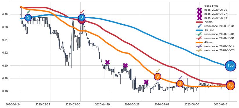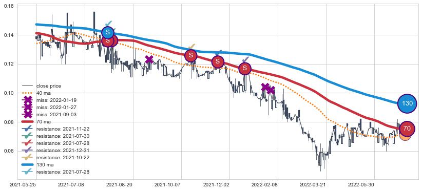 下跌趋势2021-05-25-2022-06-29,均线130, 70确认关键阻力5处