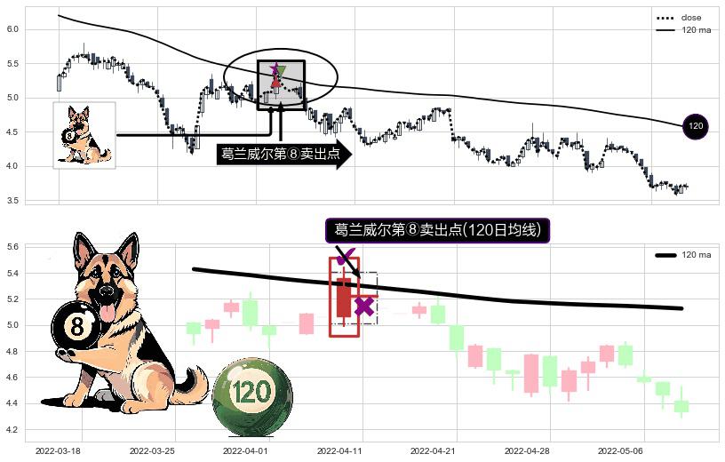 ⚀ 2022-04-11-日显现 葛兰威尔均线 120日均线 第⑧卖出点 下降趋势的中继信号,后市看跌,卖出信号