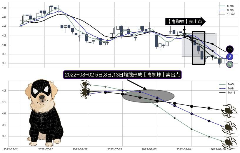 ⚀ 2022-08-02日显现 5日-8日-13日均线 【毒蜘蛛】卖出点 看空信号,后市看跌,卖出
