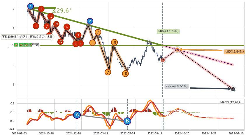 ♘ 阻力价格位5.31,可信任强度95.42%,距离最后交易2022-08-12形成的收盘价格4.30相差 +23.50%