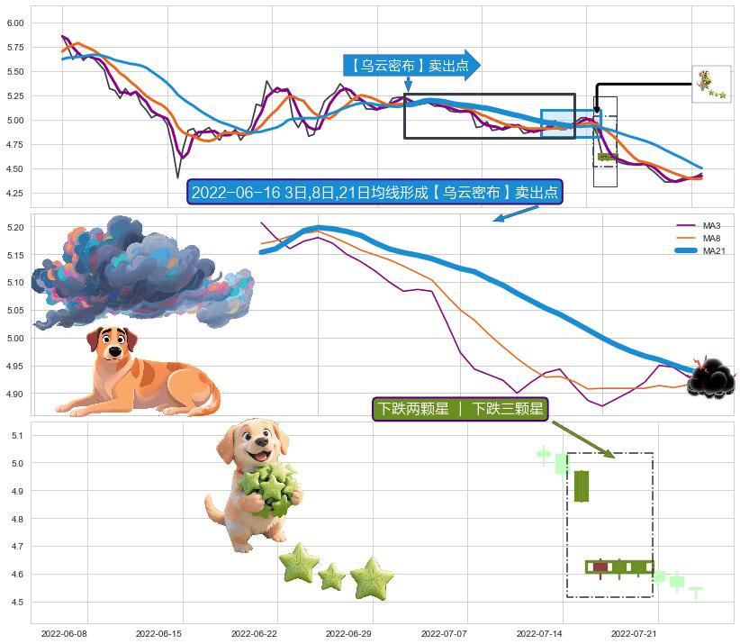 | 5 🅚:下跌两颗星 | 下跌三颗星 ➕ 🎢:【毒蜘蛛】卖出点均线组合卖出点信号形成后,猜想三条均线周期内的交易者都看空后市,持续下跌 ☞ 看空信号 ⇥ 【均线】交织【🅚线】⇥ 综合量化分数: 35 | > |