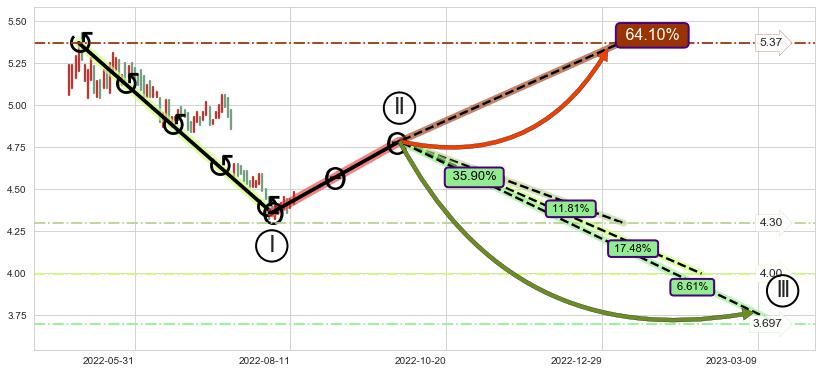 ➢ 循环浪继续向下【最高】位置(2023-01-09, 4.30),匹配聚类样本比例32.89%, 可能性概率11.81%