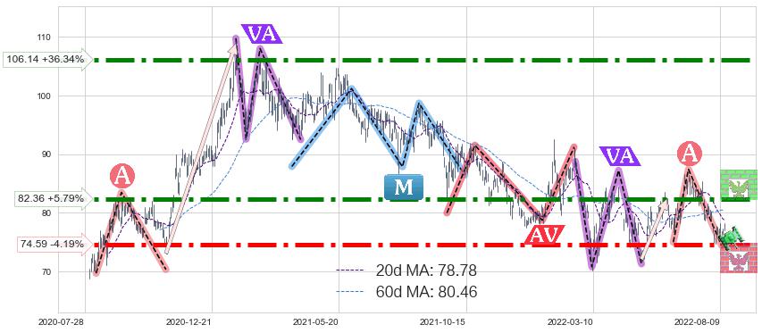♘ 支撑价格位74.59,可信任强度95.62%,距离最后交易2022-08-12形成的收盘价格77.85相差 -4.19%