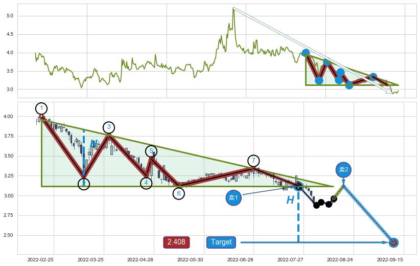➢ 【多方力量耗尽,空方打破攻守平衡点】下降三角形中继整理, 已在2022-07-25突破【支撑】颈线 3.120 →演变成下降通道
