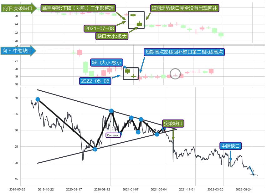 ➣ 普通缺口在【下降【对称】三角形整理】震荡整理形态中出现