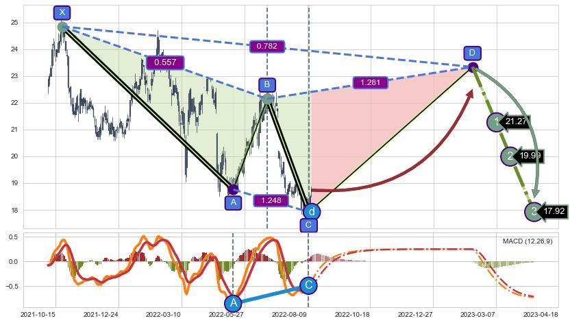 ➣ D点拟合预测价格23.34,距离最后交易收盘价格18.74相差 +24.54%