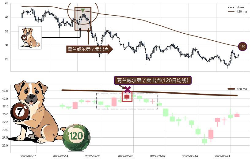 ⚀ 2022-02-25-日显现 葛兰威尔均线 120日均线 第⑦卖出点 下降趋势的中继信号,后市看跌,卖出信号
