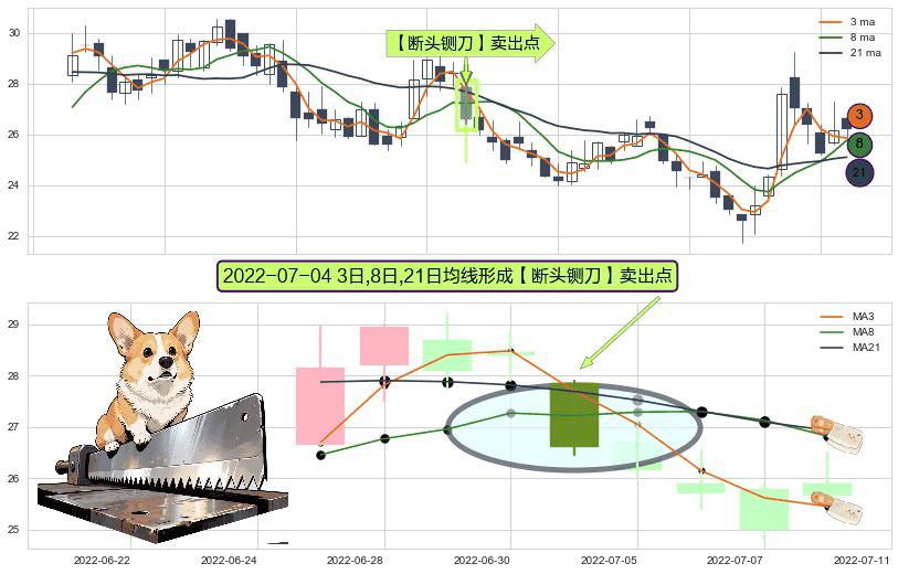 ⚀ 2022-07-04日显现 3日-8日-21日均线 【断头铡刀】卖出点 看空信号,后市看跌,卖出