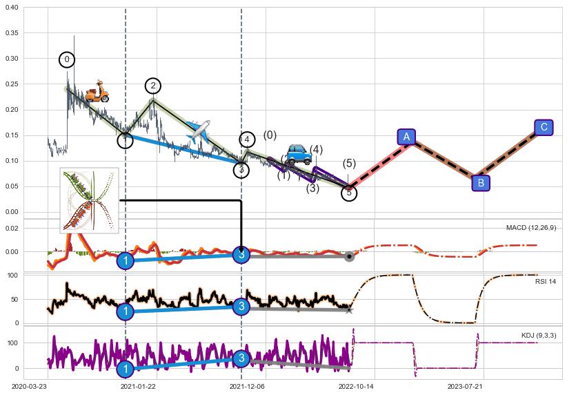 ➢ 1,3,5驱动浪MACD, RSI, KDJ走势都出现【常规背离】反转信号增强