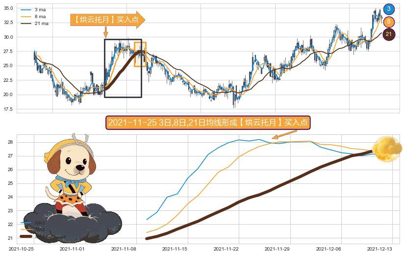 形态多维评估: ⚀ 2021-11-09日-2021-12-10日显现 3日-8日-21日均线 【烘云托月】买入点 看多信号,后市看涨,买入