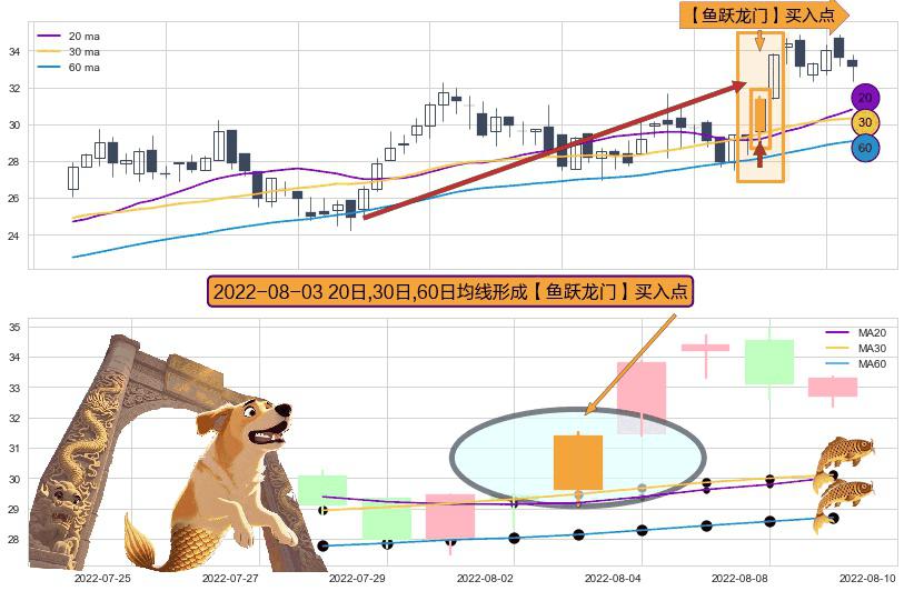 形态多维评估: ⚀ 2022-08-03日显现 20日-30日-60日均线 【鱼跃龙门】买入点 看多信号,后市看涨,买入