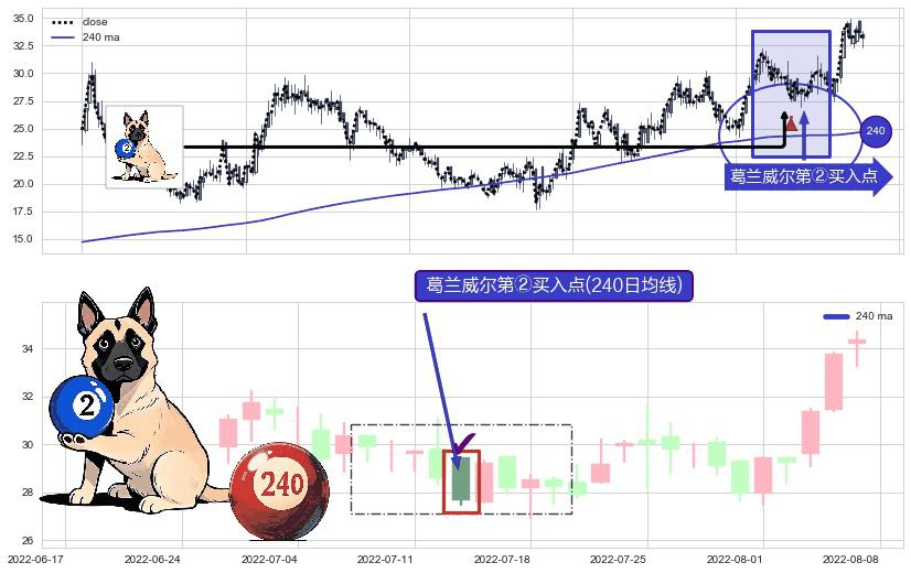 形态多维评估: ⚀ 2022-07-13-日显现 葛兰威尔均线 240日均线 第②买入点 上升趋势的中继信号,后市看涨,买进信号
