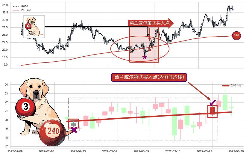 形态多维评估: ⚀ 2022-03-23-日显现 葛兰威尔均线 240日均线 第③买入点 上升趋势的中继信号,后市看涨,买进信号