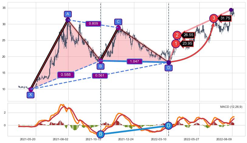 ➢ 谐波价格D点比B点低 ⤵,【MACD】指标D点比B点高 ⤴️