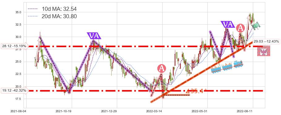 ♘ 支撑价格位19.12,可信任强度96.63%,距离最后交易2022-08-12形成的收盘价格33.15相差 -42.32%