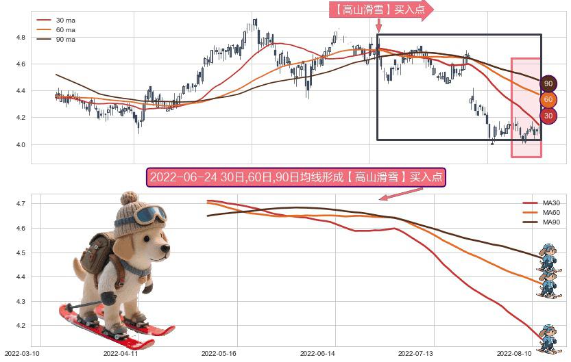 形态多维评估: ⚀ 2022-05-05日-2022-08-12日显现 30日-60日-90日均线 【高山滑雪】买入点 看多信号,后市看涨,买入
