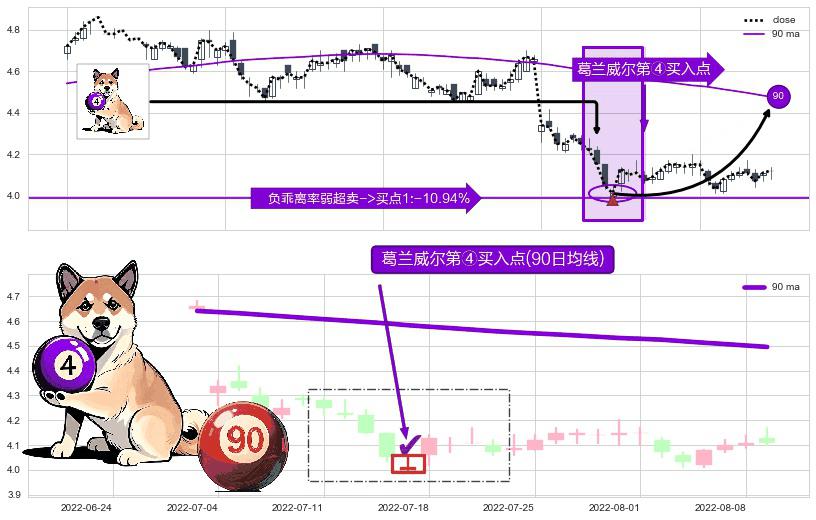 形态多维评估: ⚀ 2022-07-15-日显现 葛兰威尔均线 90日均线 第④买入点 下降趋势均值回复的短线反弹信号,后市看涨,买进信号