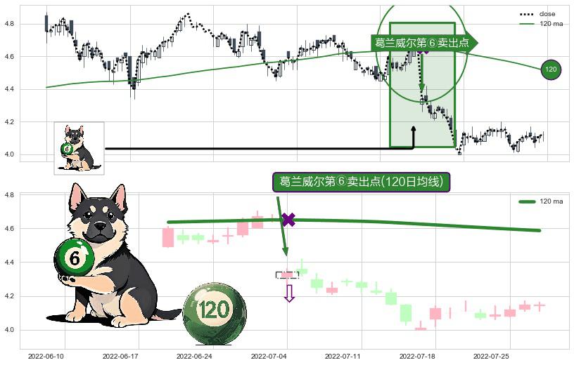 形态多维评估: ⚀ 2022-07-04-日显现 葛兰威尔均线 120日均线 第⑥卖出点 走势反转见顶信号,后市看跌,卖出信号