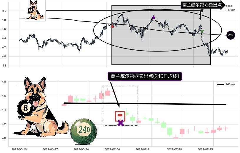 形态多维评估: ⚀ 2022-07-04-日显现 葛兰威尔均线 240日均线 第⑧卖出点 下降趋势的中继信号,后市看跌,卖出信号