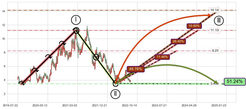 ♘ 支撑价格位3.584,可信任强度88.09%,距离最后交易2022-08-12形成的收盘价格3.850相差 -6.92%