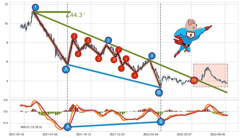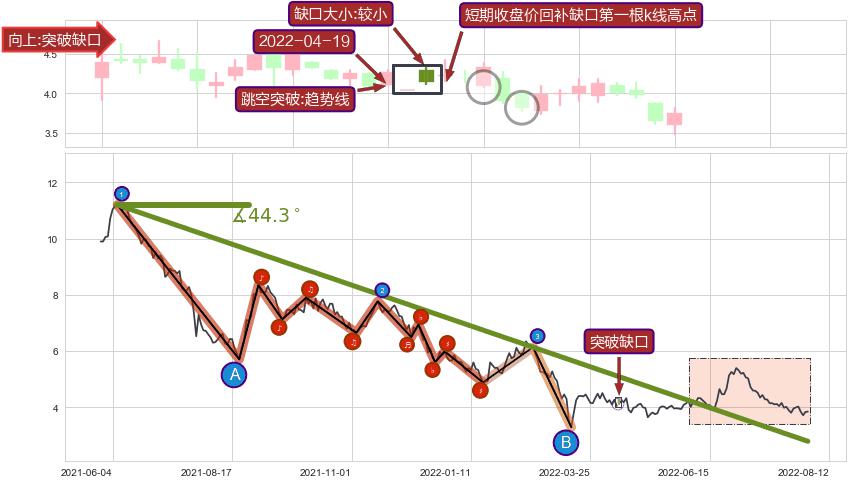 从2021-06-08至2022-04-21,共包含213个交易日,阶段股价下跌-81.34%,阶段股价变动位移路程比: 1 : 7,下跌趋势角度: 44.3