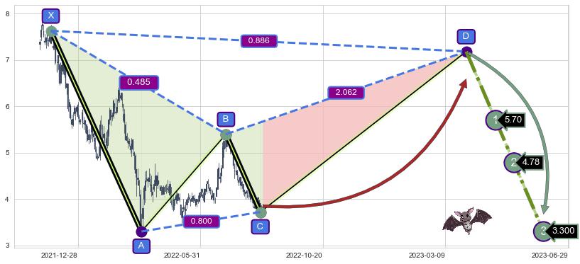 ➣ 未完成【蝙蝠】形态起点X: 2021-11-25, 已到达C点: 2022-08-10, 预测最终D点: 2023-04-03, 共340交易日