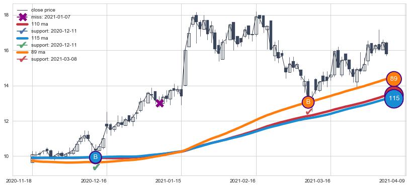 上涨趋势2020-11-18-2021-04-09,均线89, 115, 110确认关键支撑2处