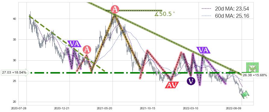 ♘ 在最后的下跌阶段2020-08-05至2022-08-12,存在 持续未破位的阻力位 ,阻力价格26.38,可信任强度88.38%,其距离最后价格22.80相差 +15.68%